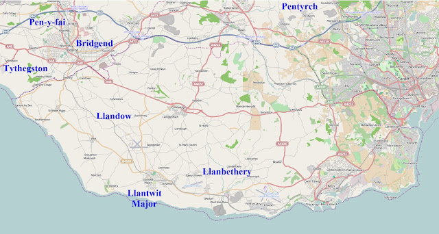 As I have explained in two other posts on this blog, my Welsh grandfather, Thomas, was adopted by the Davies family and brought up in Pontypridd. His birth certificate shows he was born elsewhere in Glamorgan - in Llantwit Major in April 1880. His mother's name is given as Mary Powell, a dairymaid, but the space for the name of the father has been left blank - and it has always remained unknown.
