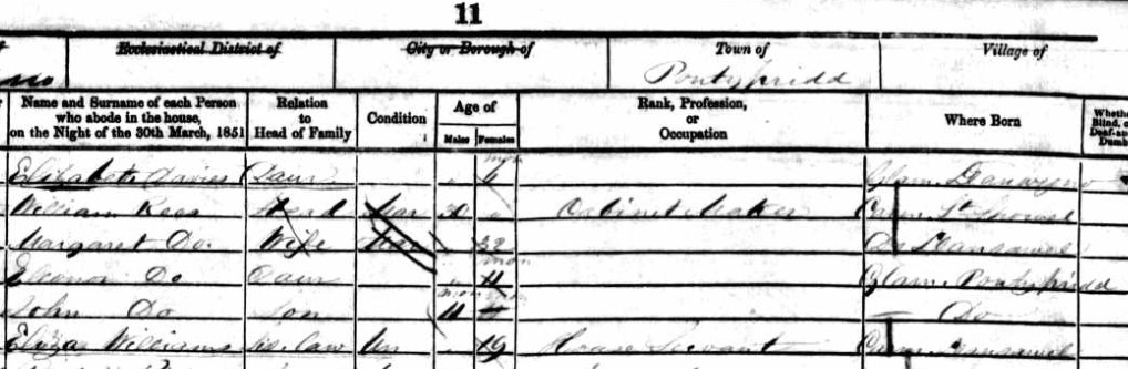 Without having any other hints about her life story, it's not easy to reliably trace further records on such a common Welsh name. However, she definitely does appear in one - the 1851 census for Pontypridd - as a 'sister-in-law' in the household of my own second great grandmother, Margaret Rees née Williams: